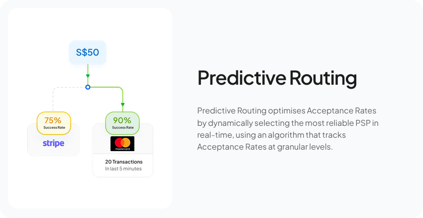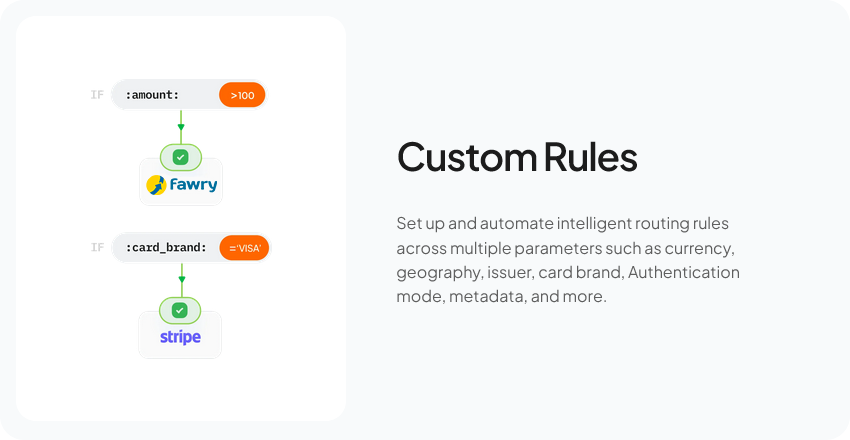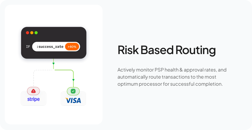 Maximises Success rates by optimising transactions in real-time. Build automated & intelligent routing rules across payment orchestration parameters, without writing any code.